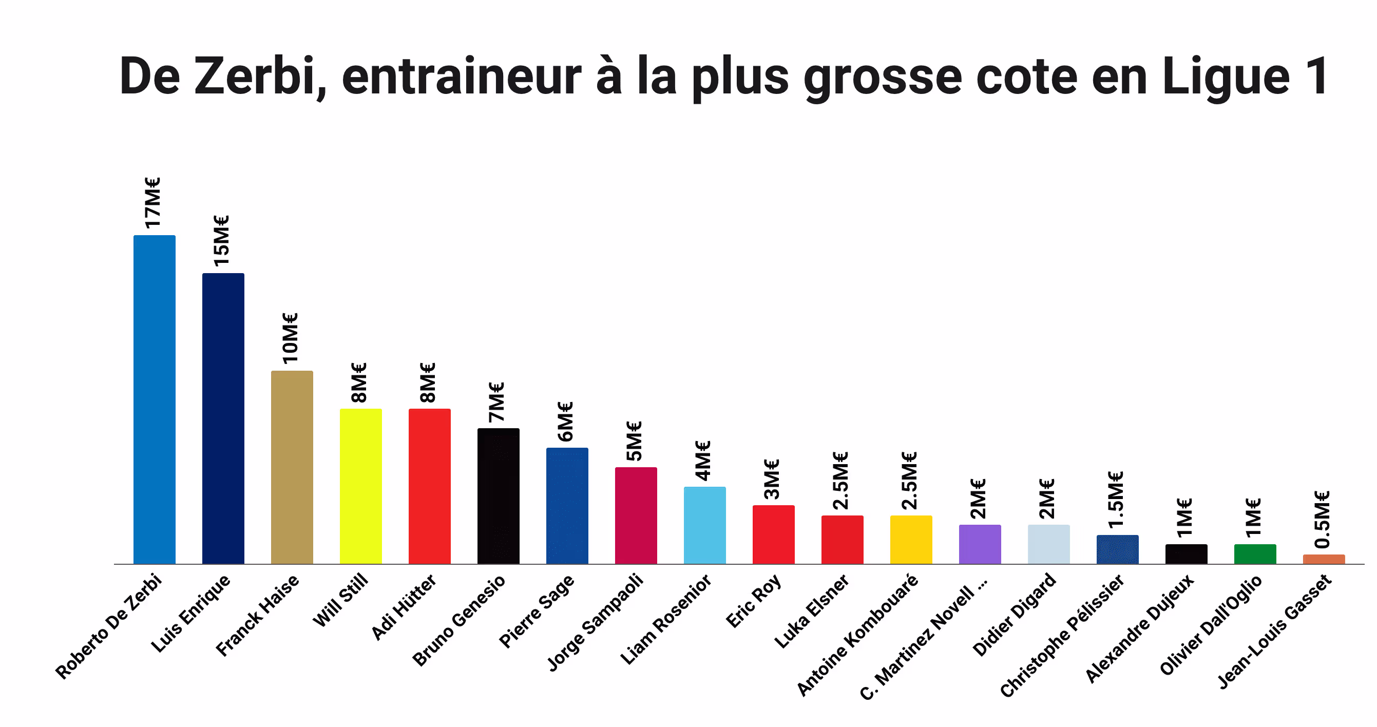 Roberto De Zerbi est l'entraineur de Ligue 1 le plus valorisé avec une valeur estimée à 17M€, plus que tout autre coach de l'élite.