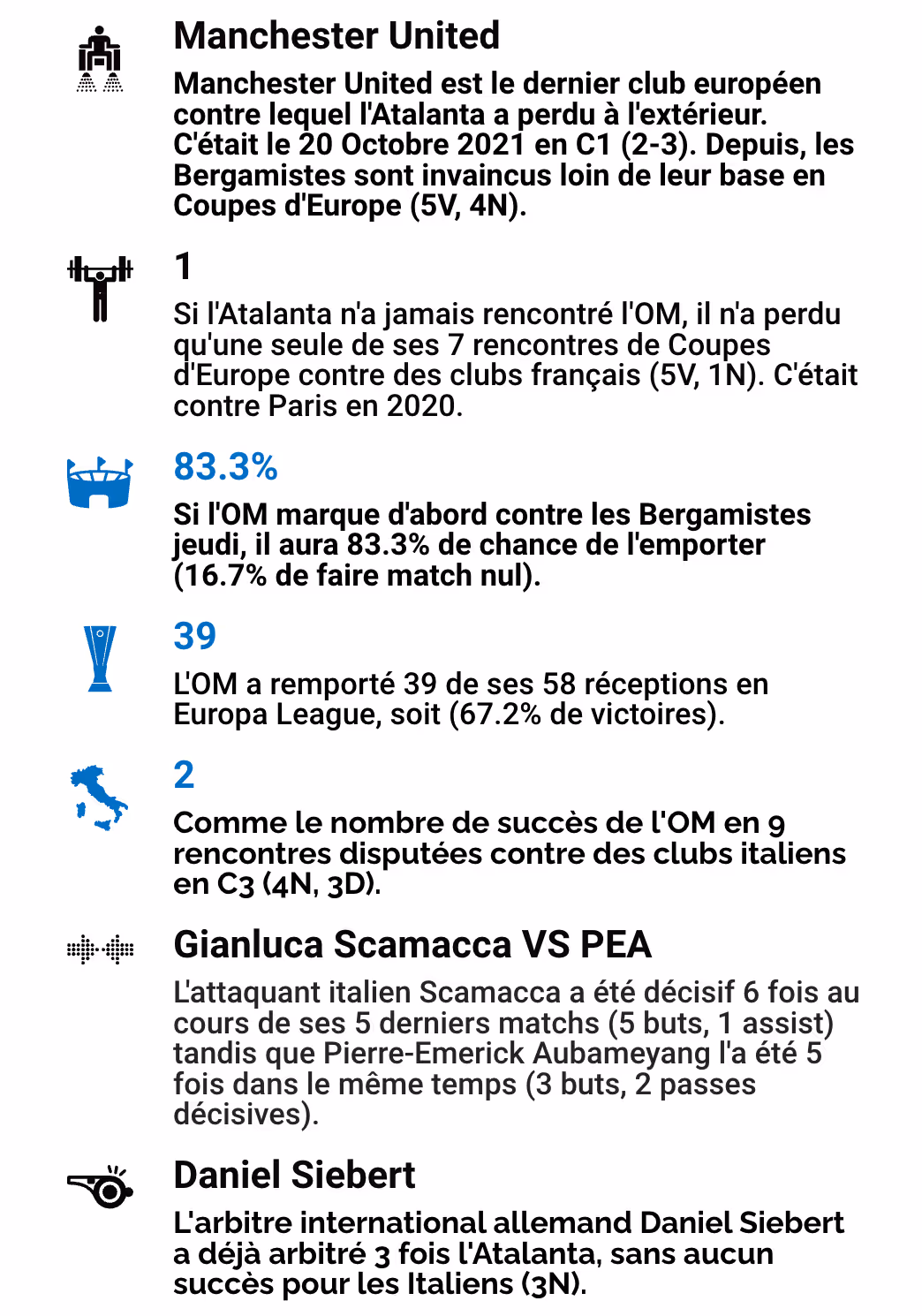 Les statistiques marseillaises et bergamasques avant l’opposition entre les deux formations, jeudi 2 Mai à 21h au Stade Vélodrome pour le compte des 1/2 de Finale Aller de l'Europa League 2023-2024.