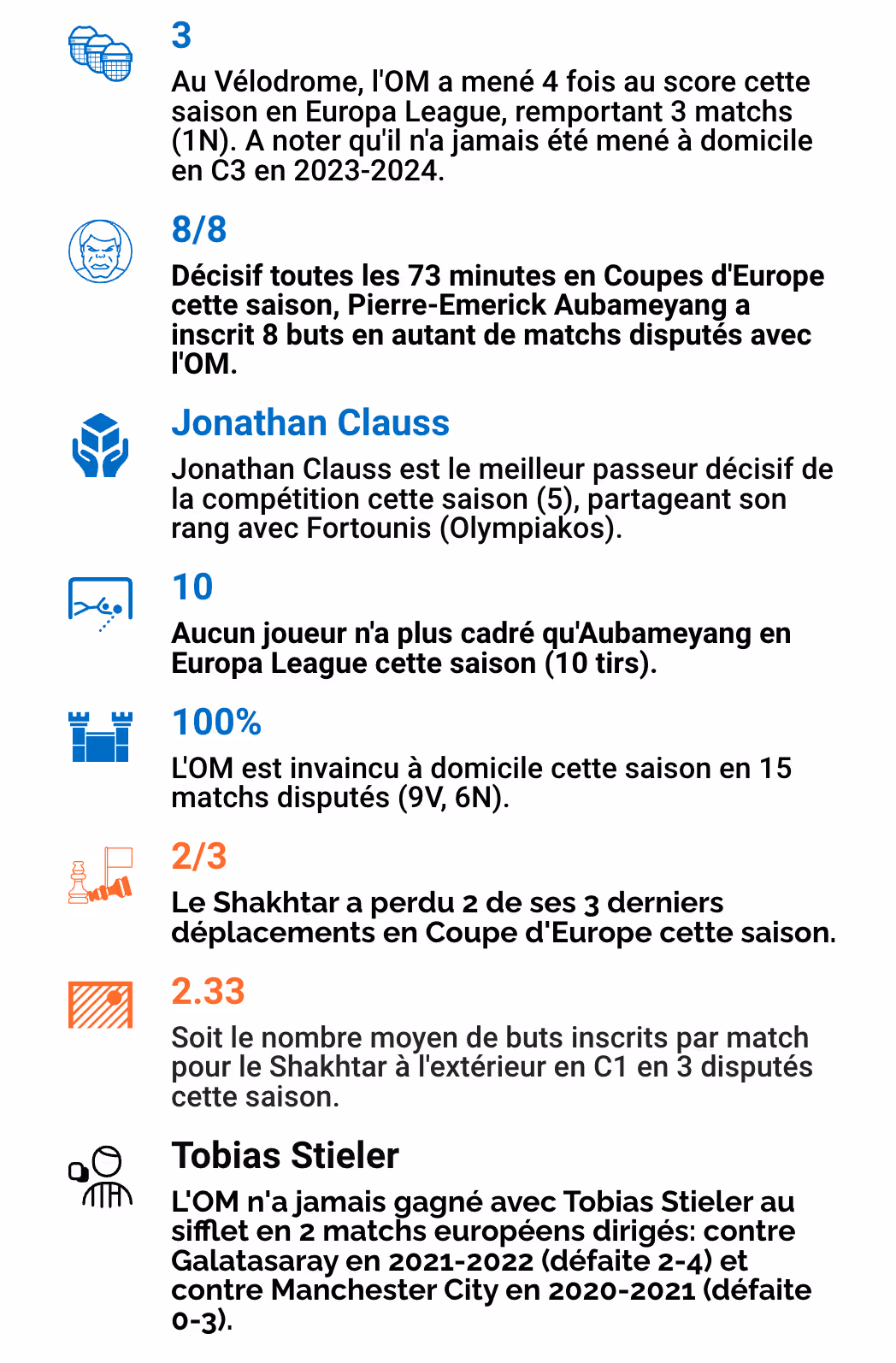 Les statistiques marseillaises et ukrainiennes avant l’opposition entre les deux formations, jeudi 22 février à 21h au Stade Vélodrome pour le match retour des barrages de l'Europa League en 2023-2024.