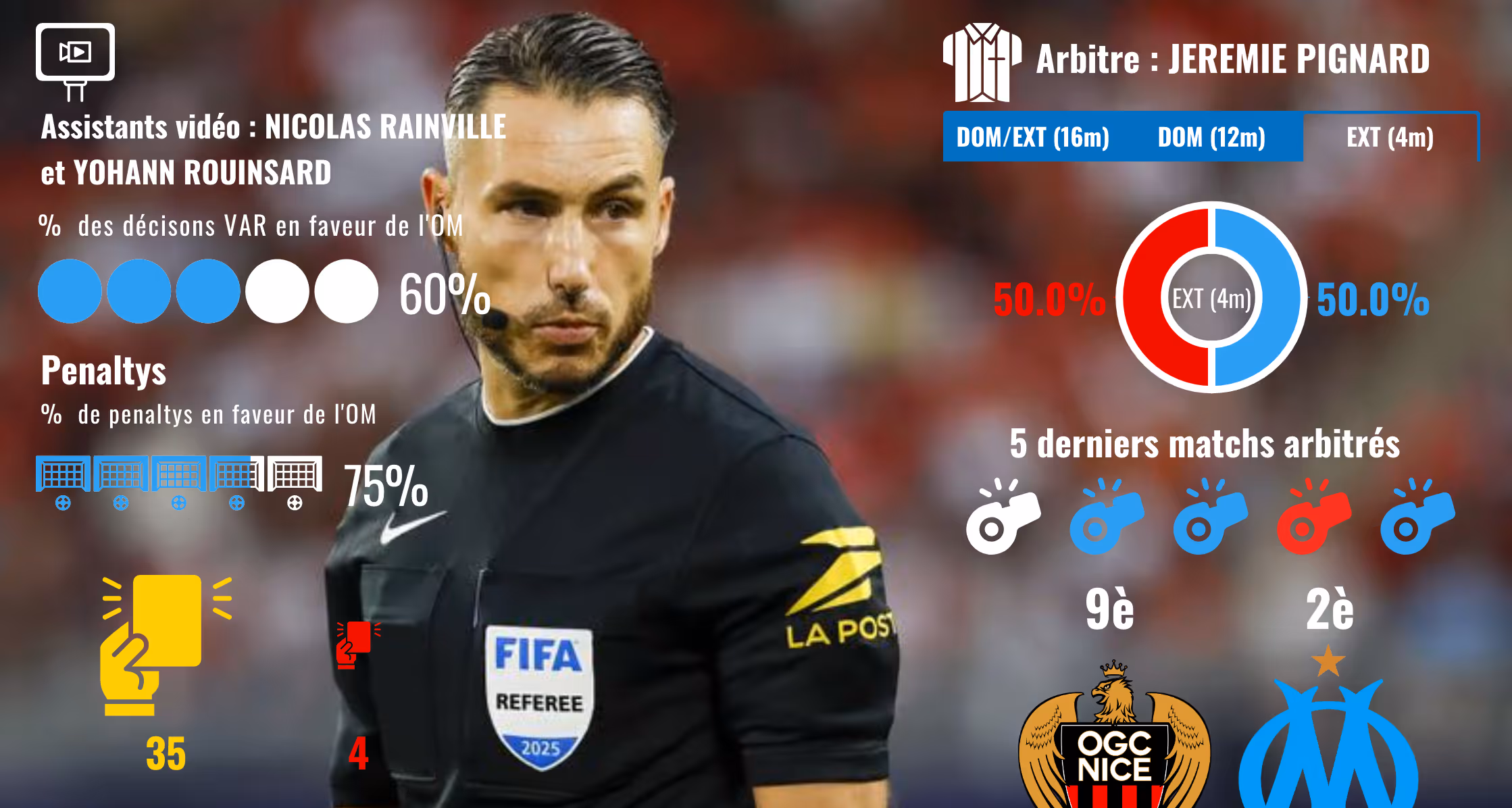 Jeremie Pignard le 17è match de l'OM de sa carrière, si ses statistiques sont assez flatteurs quand il officie au Vélodrome (12 matchs) avec deux rencontres sur trois remportées par les Olympiens, son bilan à l'extérieur est plus contrasté (50% de victoire et 50% de défaites). Il sera assisté à la VAR de Rainville et Rouinsard qui ont des décisions plutôt opposées quand l'OM joue. Enfin, il est à noter que tous arbitres vidéo confondues, 100% des décisions ont été en faveur de l'OM contre Nice parmi les arbitres en exercice.