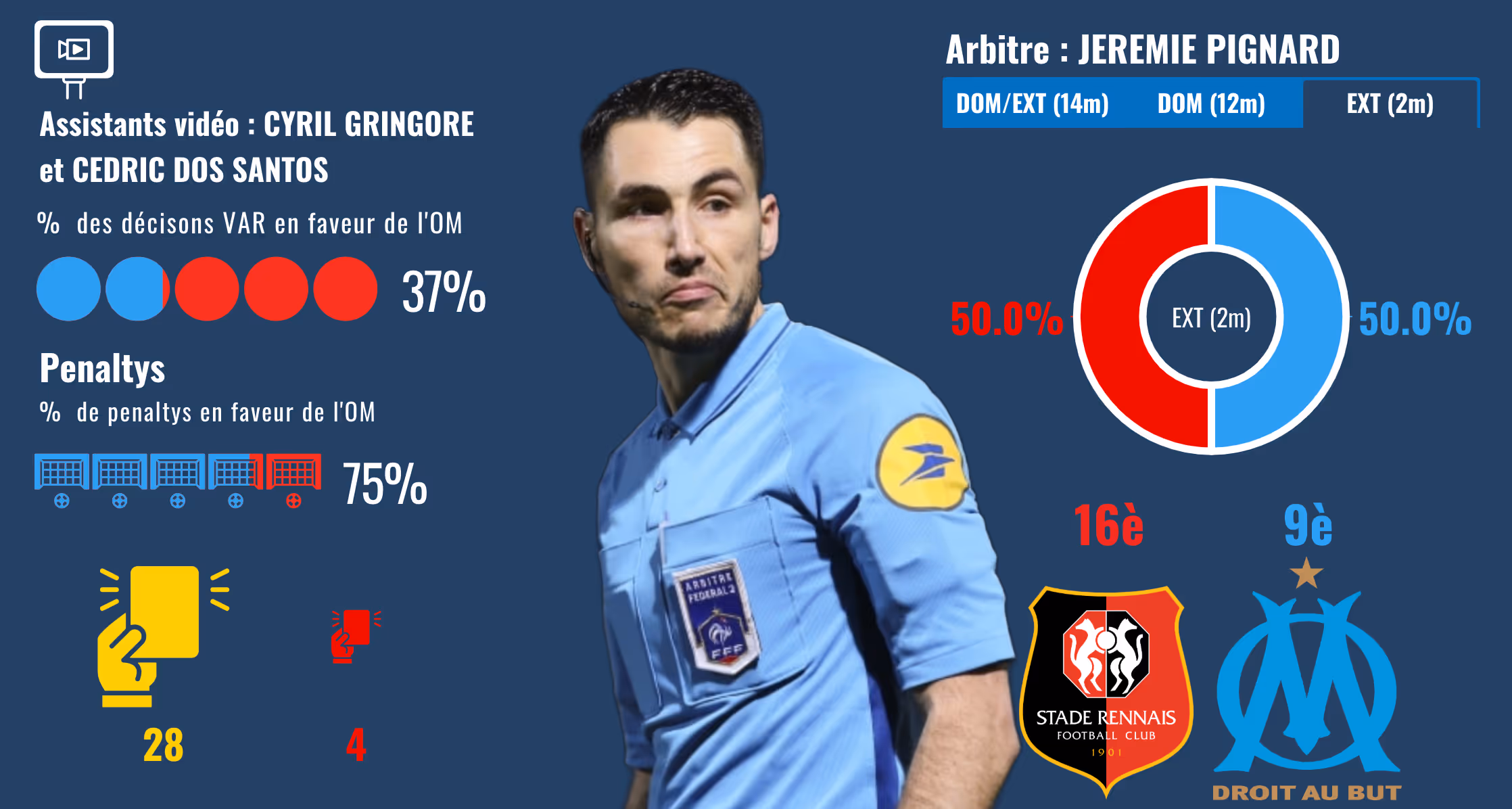 13# Avec Jeremie Pignard au sifflet, l'OM enregistre 100% de victoires contre Rennes. A noter que 8 penaltys ont été sifflés contre cet adversaire, un record parmi les arbitres en exercice (5 en faveur de l'OM, 3 en sa défaveur).