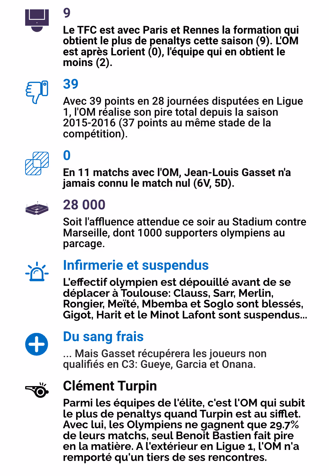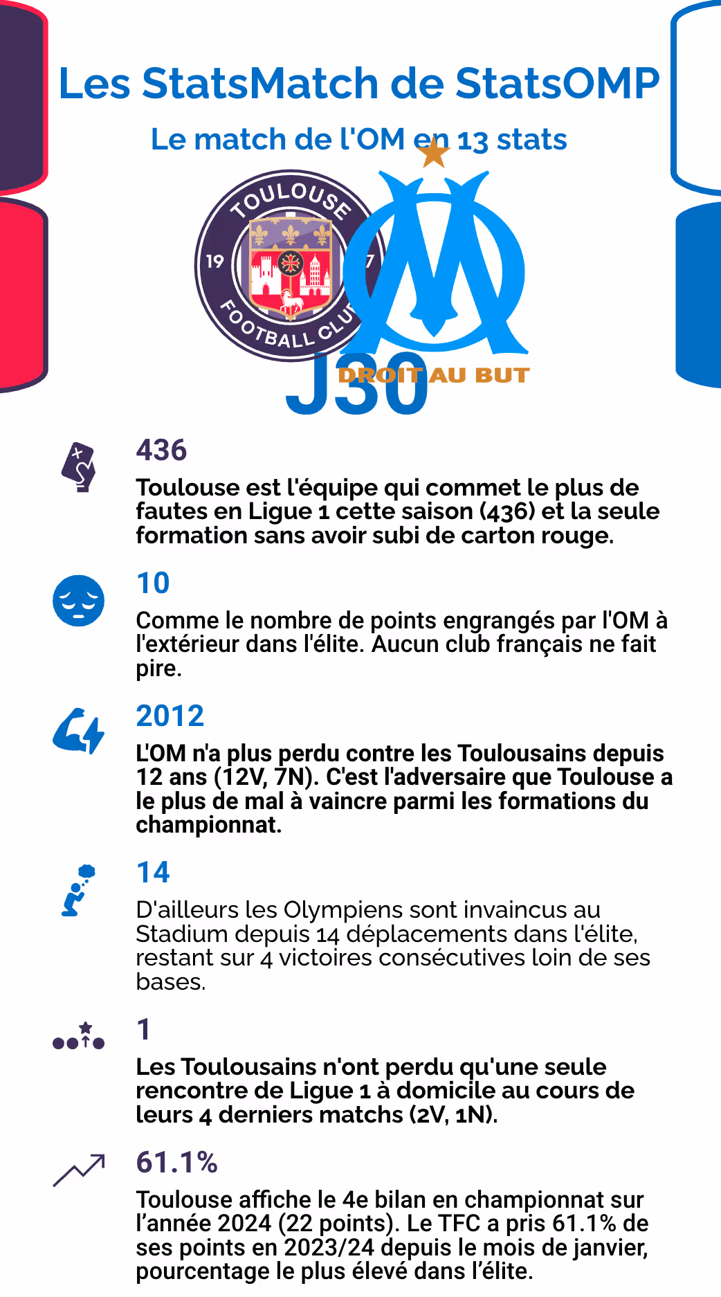 Les statistiques marseillaises et toulousaines avant l’opposition entre les deux formations, Dimanche 21 Avril à 19h au Stadium lors de la 30è journée de Ligue 1 2023-2024.